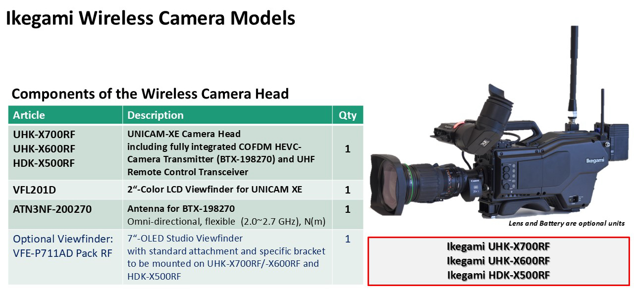 The Ikegami wireless camera (e.g. UHK-X700RF/ -X600RF and HDK-X500RF) consists of the UNICAM XE camera head plus the fully integrated transmitter section (BTX-198720). Adding the 2”-color LCD monocular viewfinder (Type: VFL-201D) and the omnidirectional antenna (Type: ATN3NF-200270) will complete the portable camera unit. As another viewfinder option for Tripod/EFP applications, the new 7-inch OLED Studio viewfinder (Type: VFE-P711AD Pack RF) can be mounted featuring a special bracket to attach the studio viewfinder to the rear side of the wireless camera.