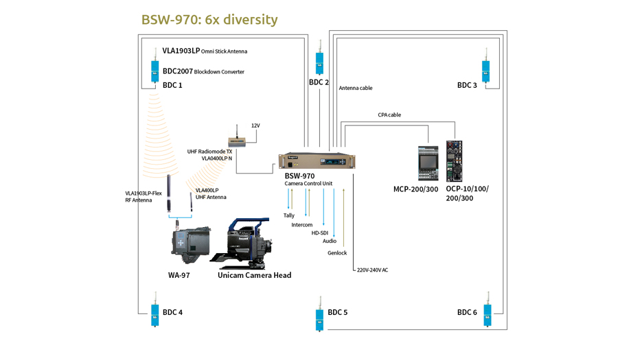 This outperforming 6-way diversity base station BSW-970 is engineered for mobile and stationary requirements. The internal decoder provides many professional features like ASI, SDI, HD-SDI, component or composite and analog / embedded audio outputs with an end-to-end low delay.It features a genlock link to the wireless camera to ensure a fixed and stable latency. Full duplex camera remote control is integrated as well as 4 wire intercom. The performance and reliability is proven by its use in the most challenging environments around the world. For many users, the BSW-970 provides the hassle free use of wireless camera systems.